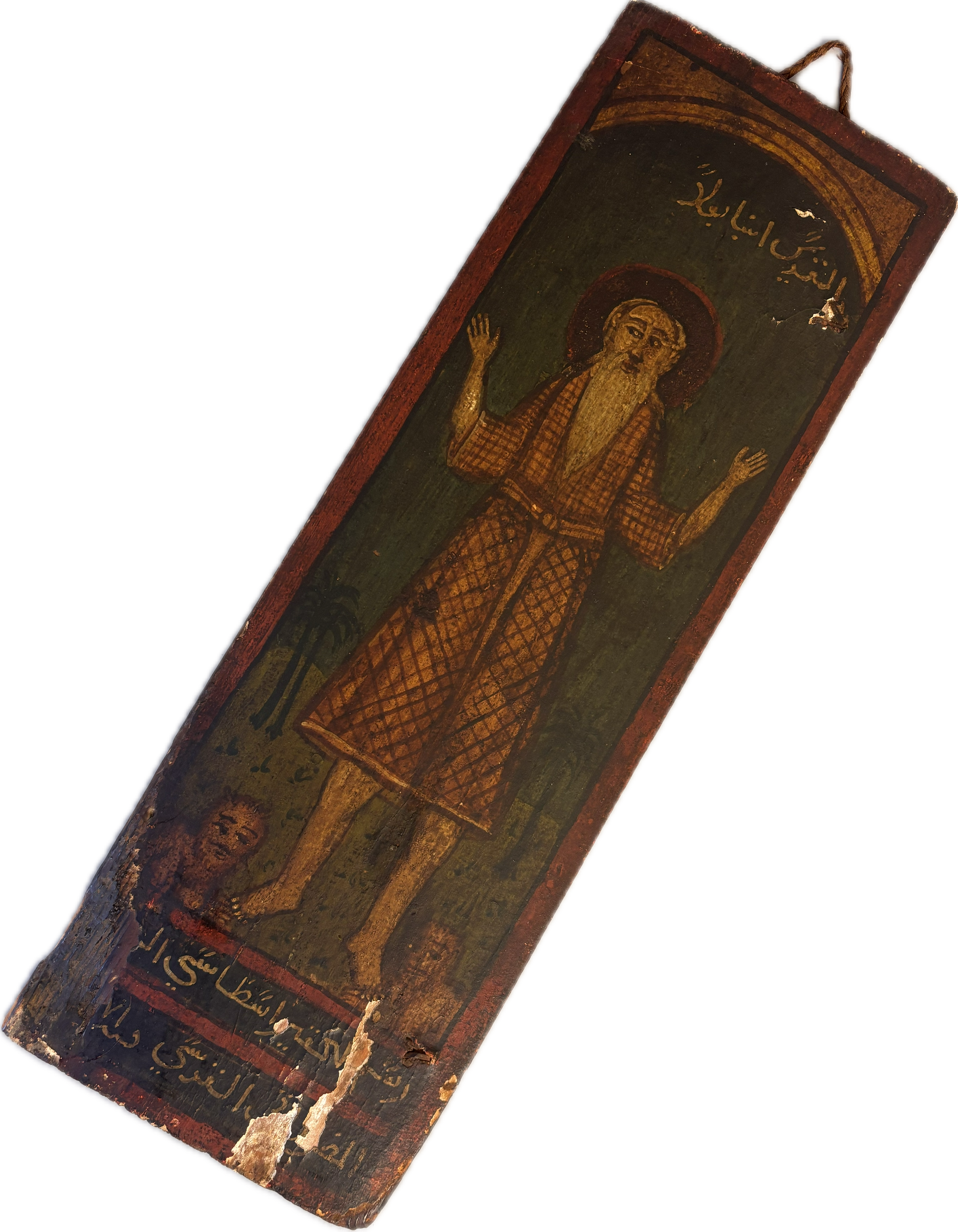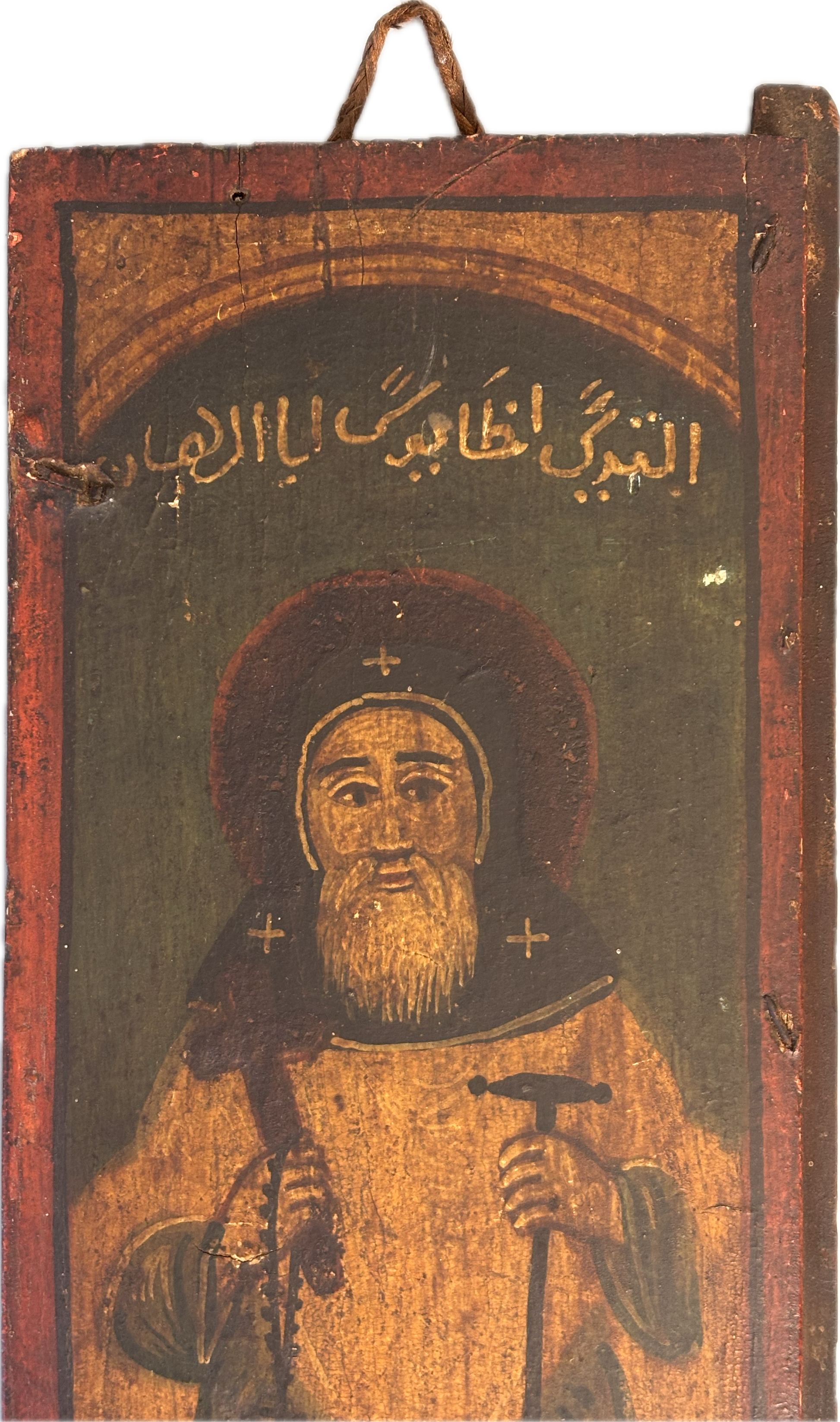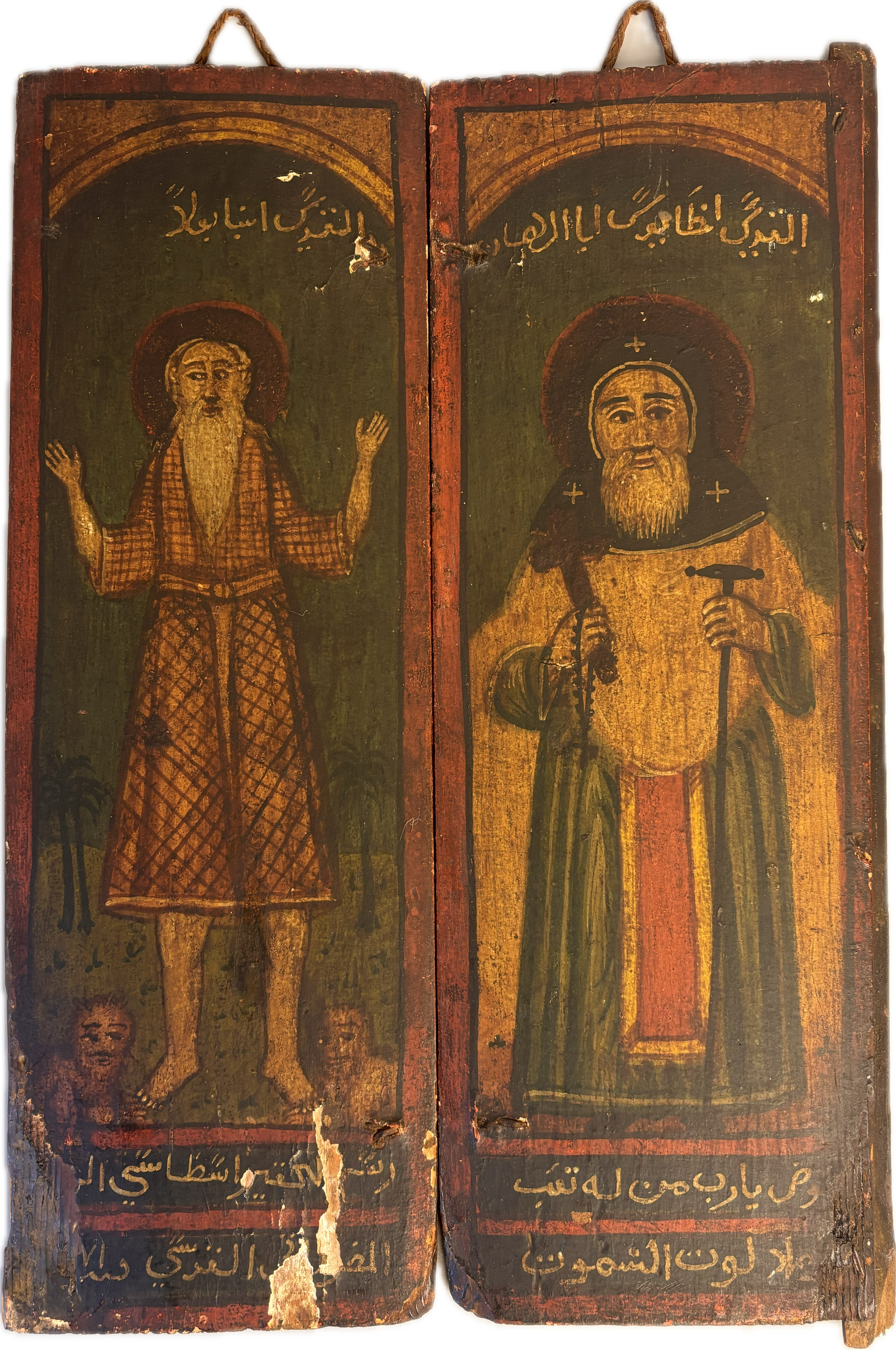 These 18th-century Ottoman hand-painted wooden panels depict two Egyptian Christian Coptic saints. Saint Paul of Thebes (Anbā Būlā), known as the first Christian hermit, who symbolized a life of complete solitude and devotion. Saint John the Short (also called John Colobus) is celebrated for his humility and spiritual guidance.